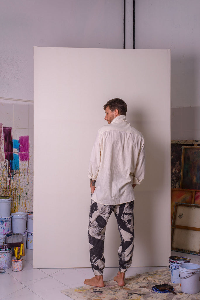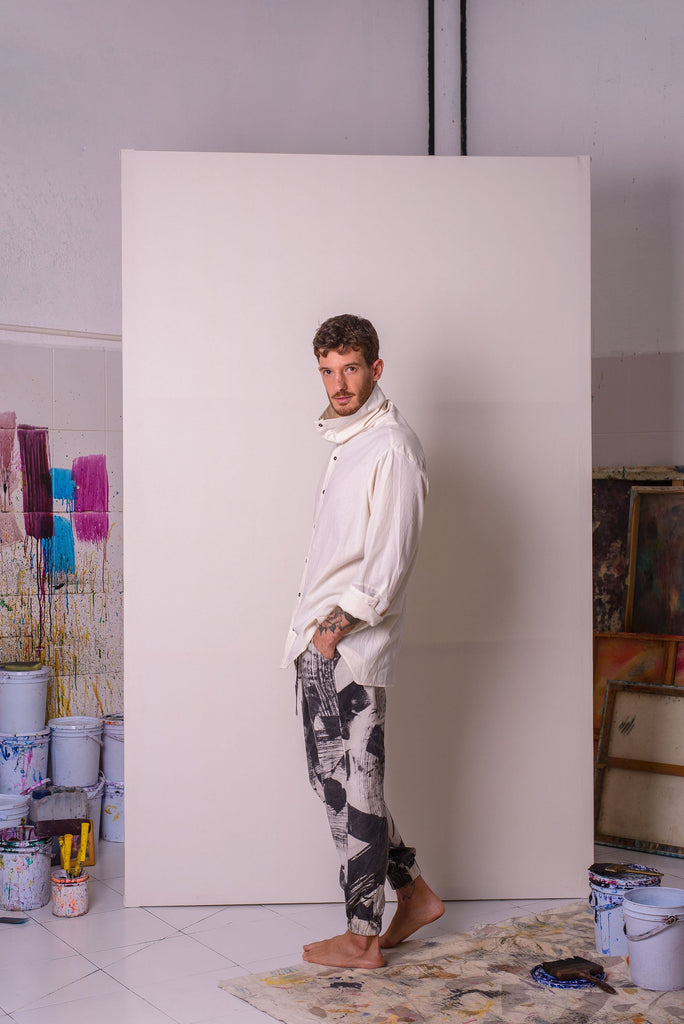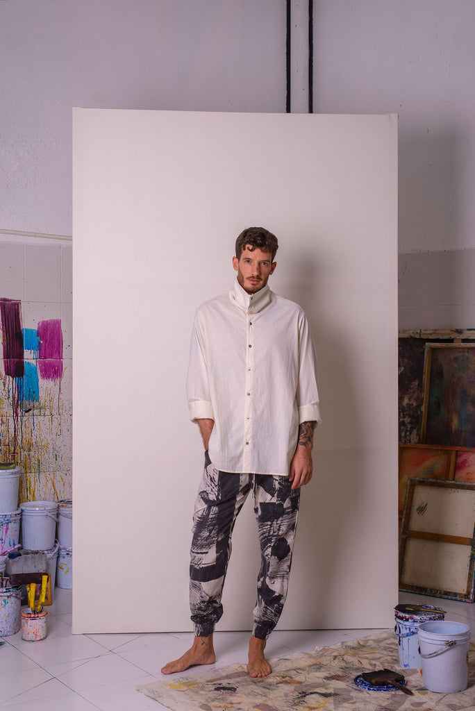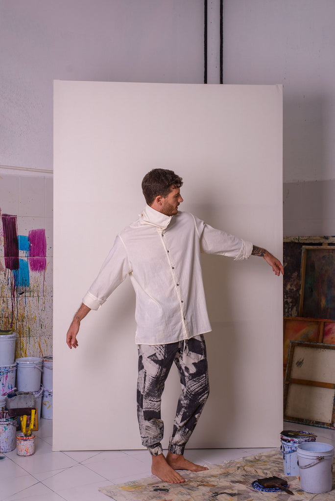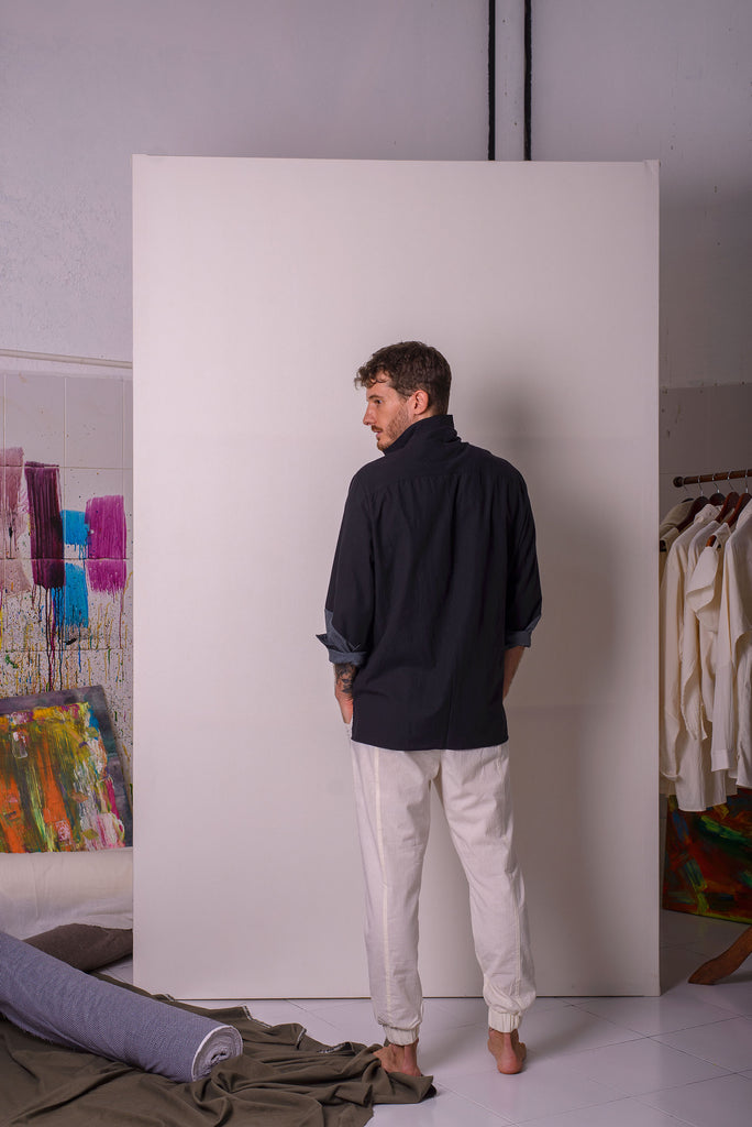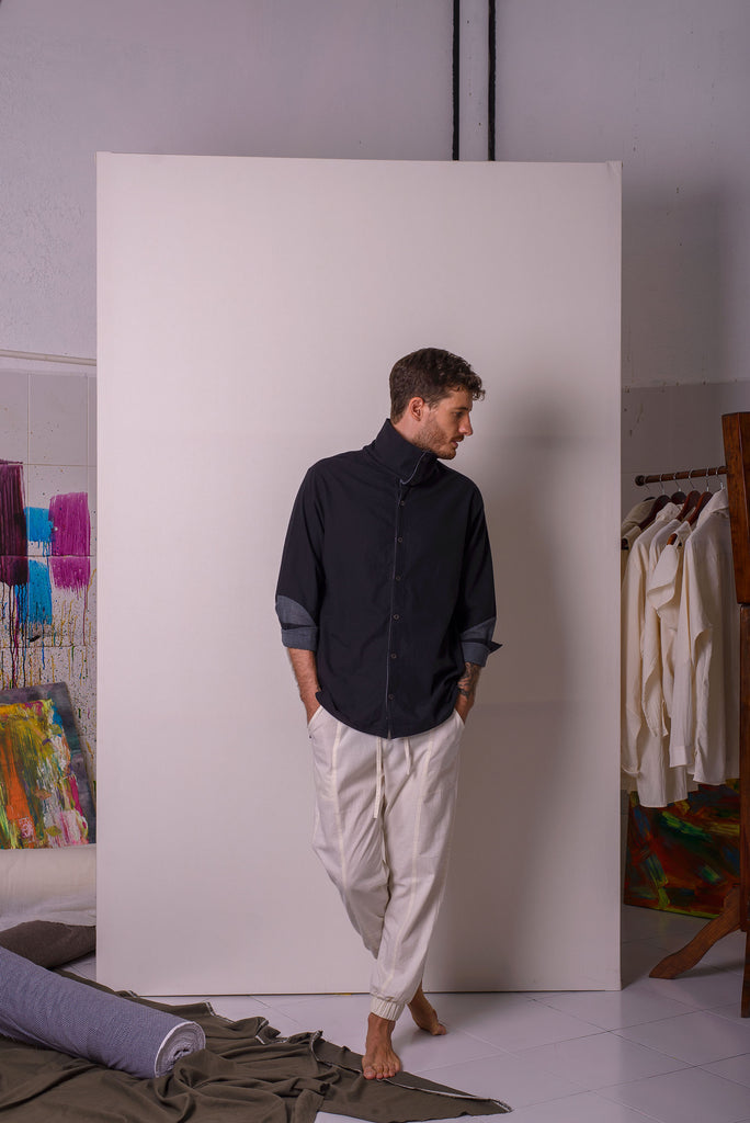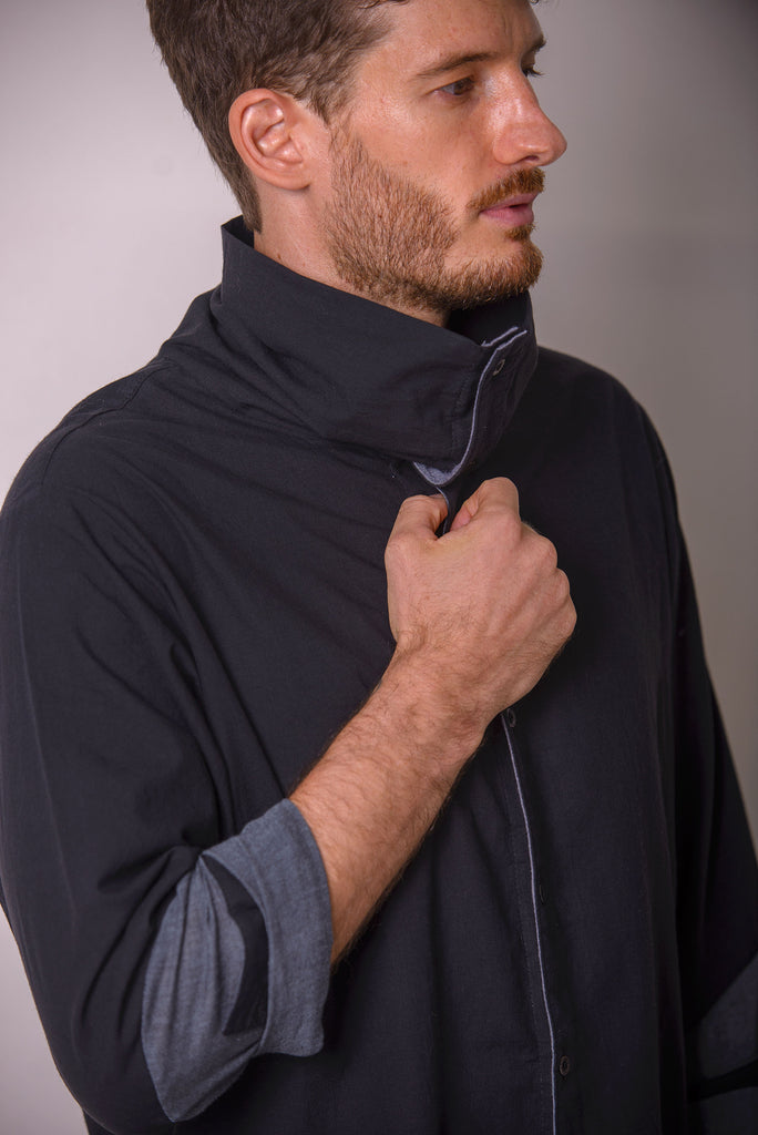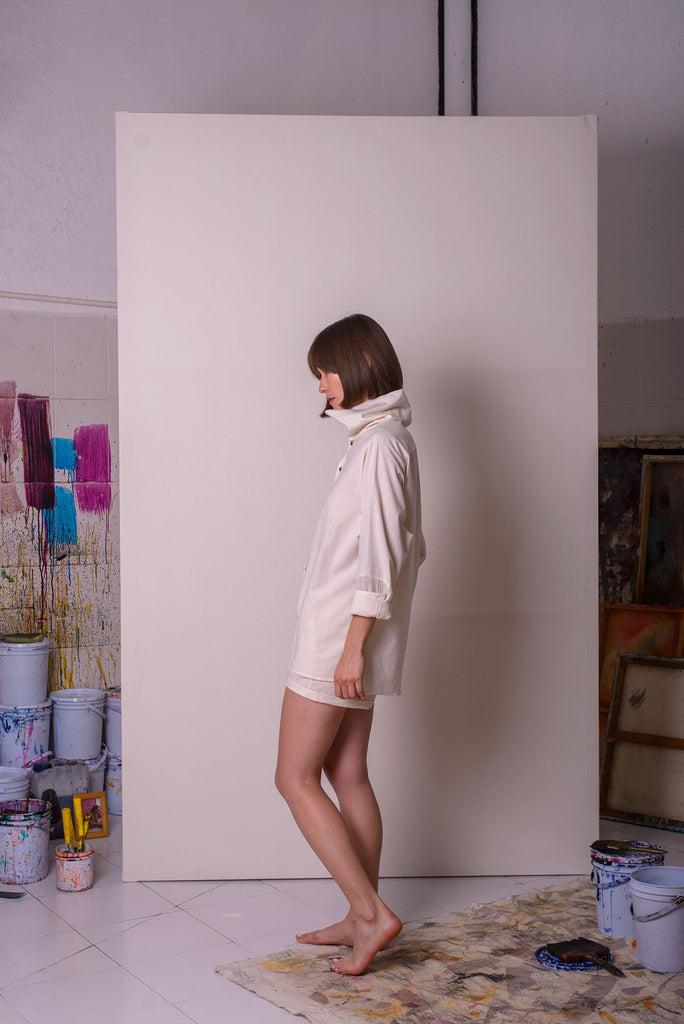Contrasting lightweight cotton in diagonal cut at 3/4 length