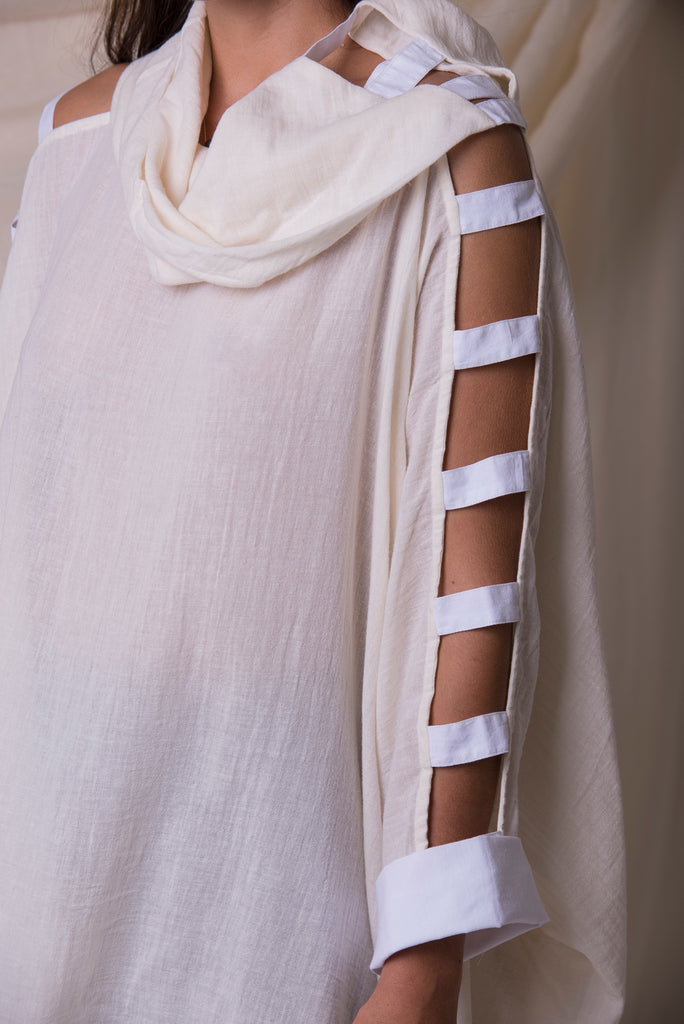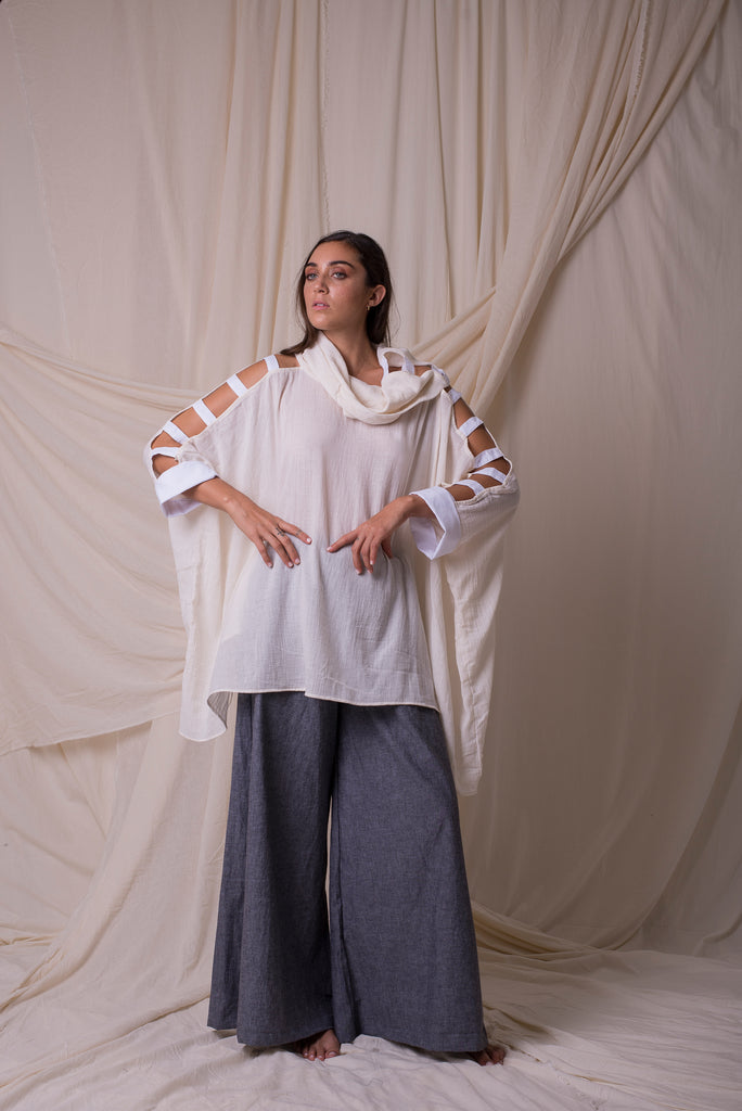 Oversized cowl neck with matching ladder cut-out in contrasting high density cotton weave