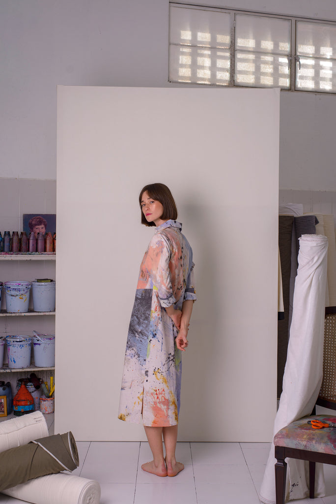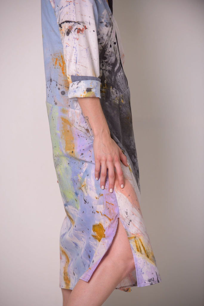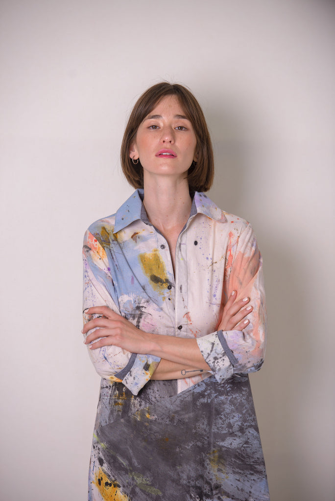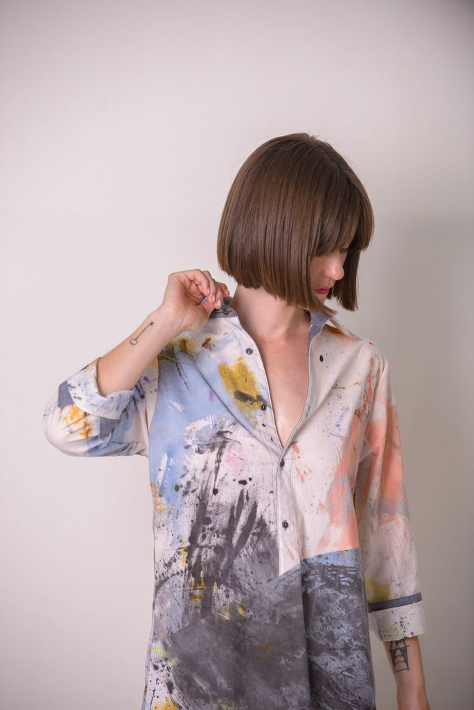 Button placket, cuff and neckline interiors in contrasting tighter weave